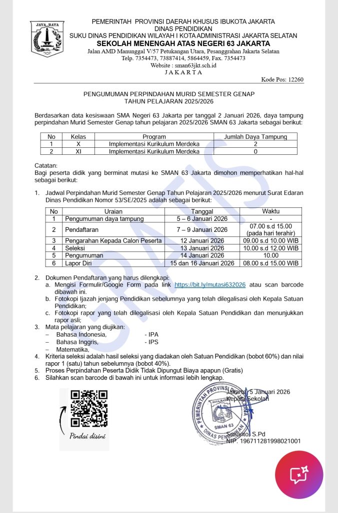 PENGUMUMAN MUTASI SEMESTER GENAP TAHUN AJARAN 2025-2026 Tinggalkan Komentar / 63, INFORMASI / Oleh sman63jkt